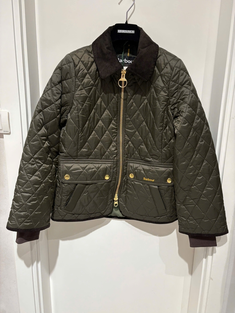 Áo khoác Barbour dáng quilted (chần bông) với họa tiết caro chần chỉ đặc trưng, tông xanh rêu cực sang. Cổ áo nhung nâu tạo điểm nhấn vintage, khóa kéo vàng và nút kim loại đồng bộ giúp tổng thể nổi bật nhưng vẫn tinh tế. Form áo đứng, nhẹ, giữ nhiệt tốt – mặc đi làm, đi chơi hay du lịch đều đẹp xuất sắc.