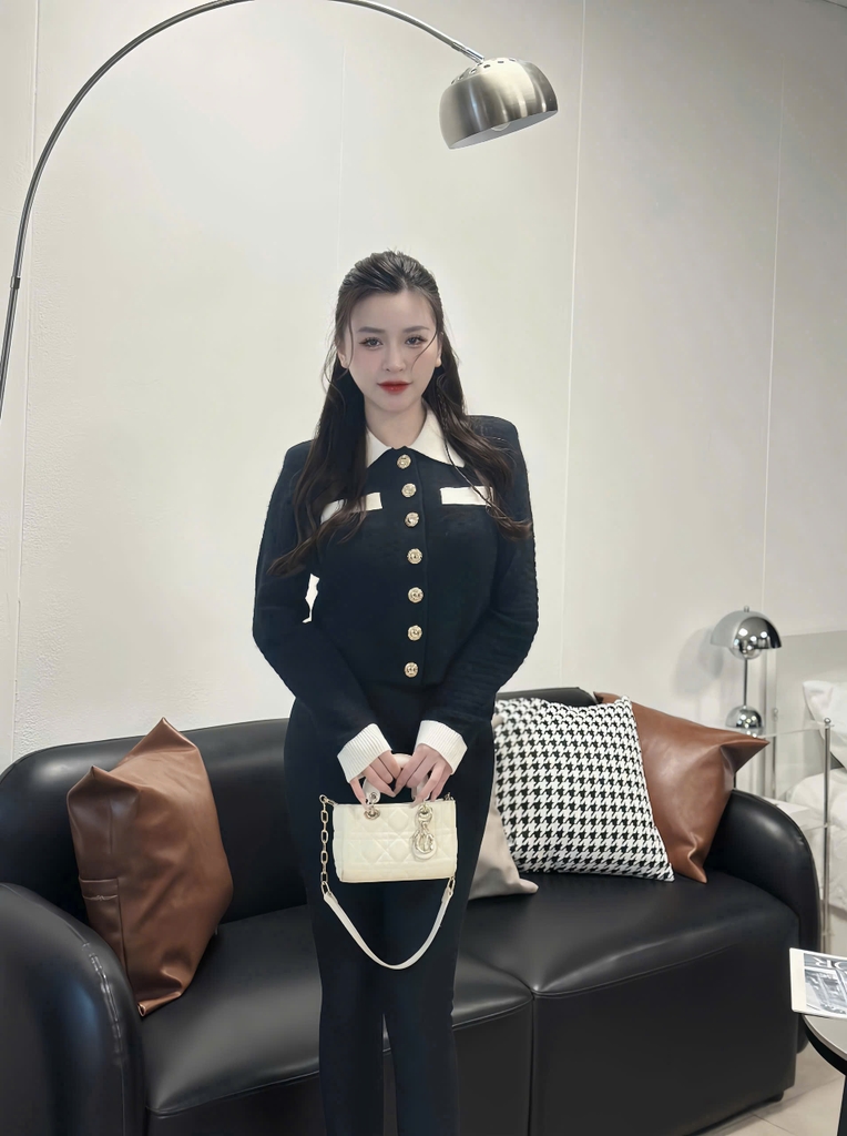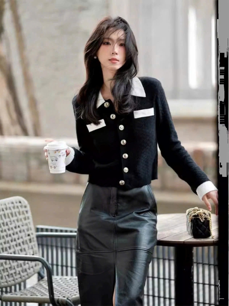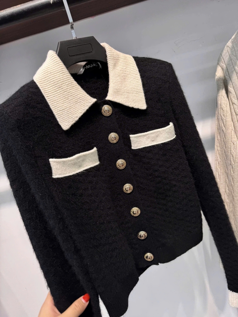 ✨ Thiết kế cardigan cổ bẻ phối màu đen – trắng kinh điển, mang đến sự thanh lịch chuẩn phong cách quý cô hiện đại.