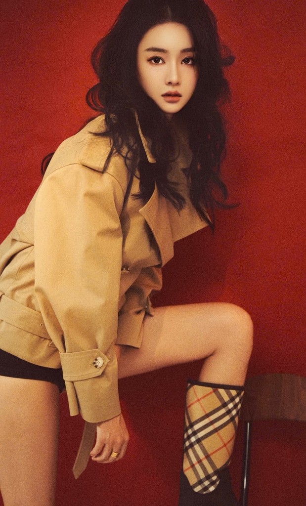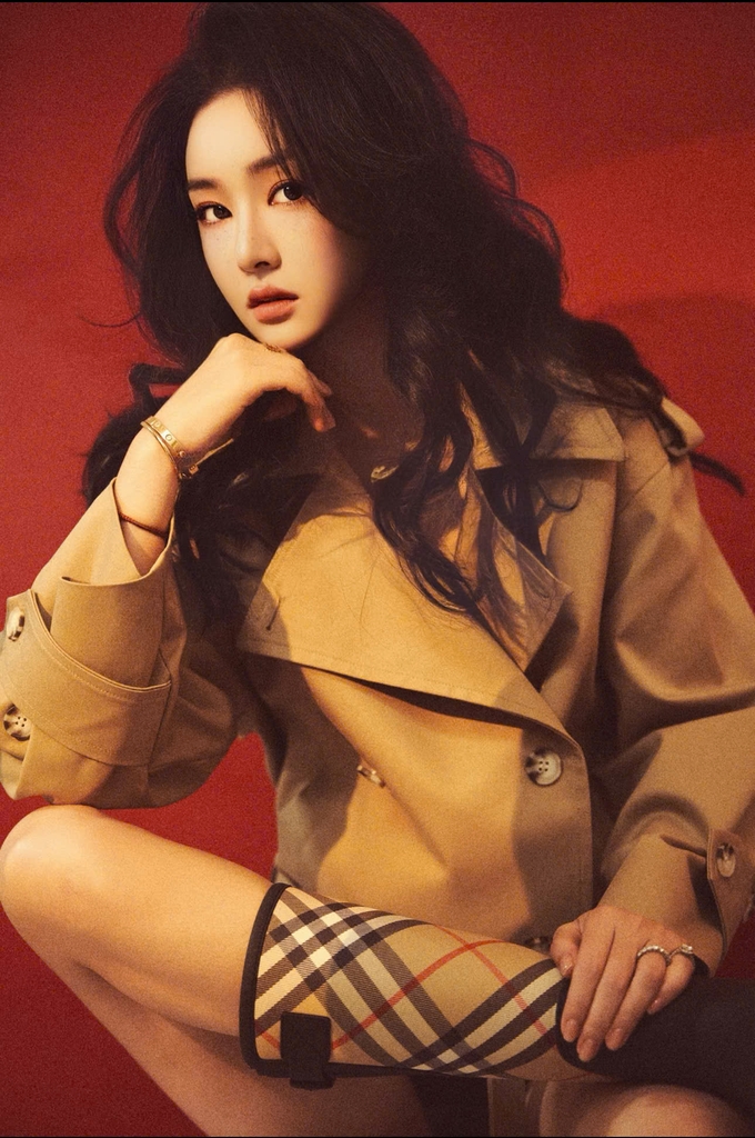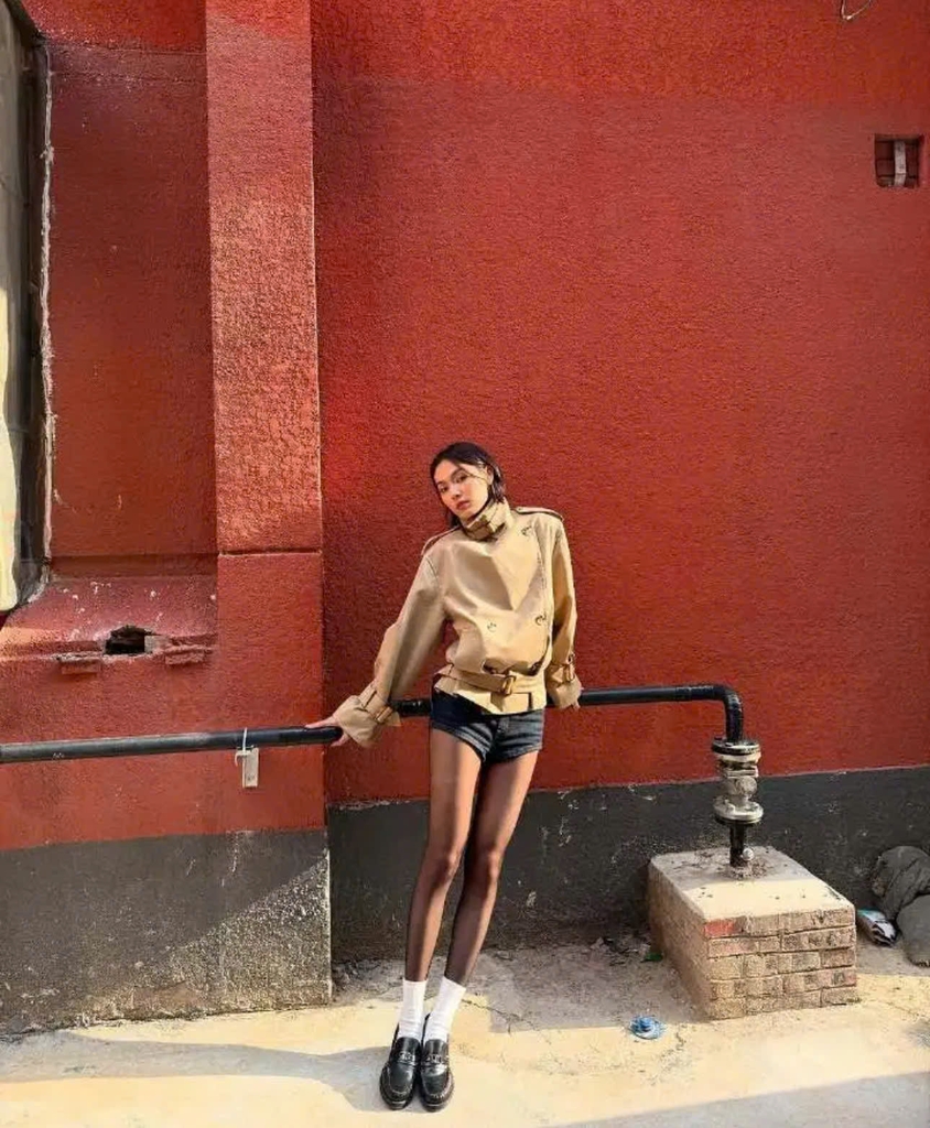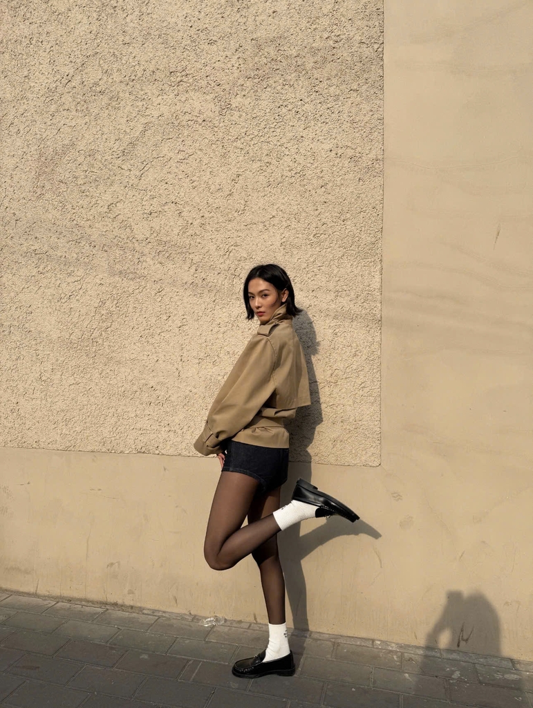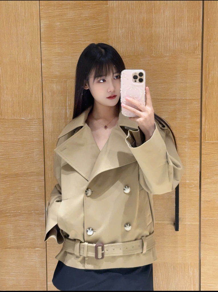 Áo khoác dáng ngắn, cổ ve to bản, hàng khuy đôi và chi tiết đai thắt eo tôn dáng.