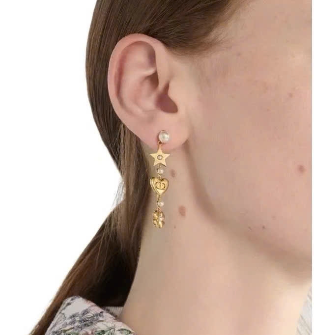 Bông tai Dior dáng dài sang trọng, tone vàng thời thượng. Thiết kế kết hợp hạt ngọc, biểu tượng trái tim và họa tiết bông mềm mại – tinh tế, nữ tính và cực kỳ nổi bật khi lên tai. Sản phẩm nhẹ, đeo êm, phù hợp cả đi chơi, dự tiệc hay phối váy áo nhẹ nhàng.