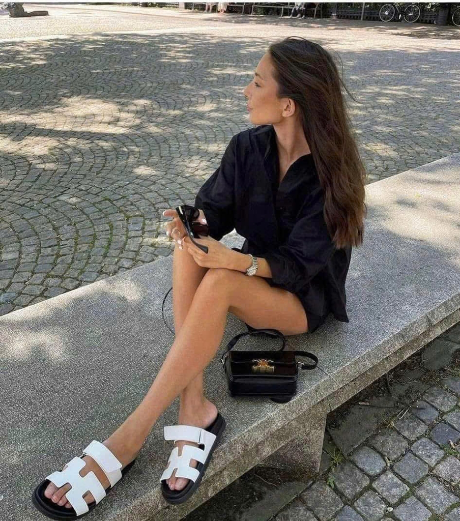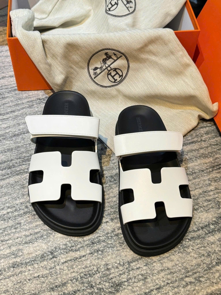 Dép Hermès Izmir phiên bản trắng với biểu tượng “H” đặc trưng, thiết kế tối giản nhưng tỏa sáng mọi outfit.