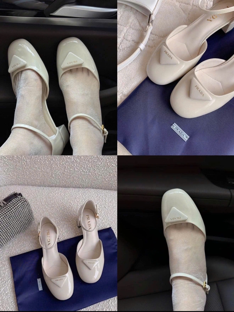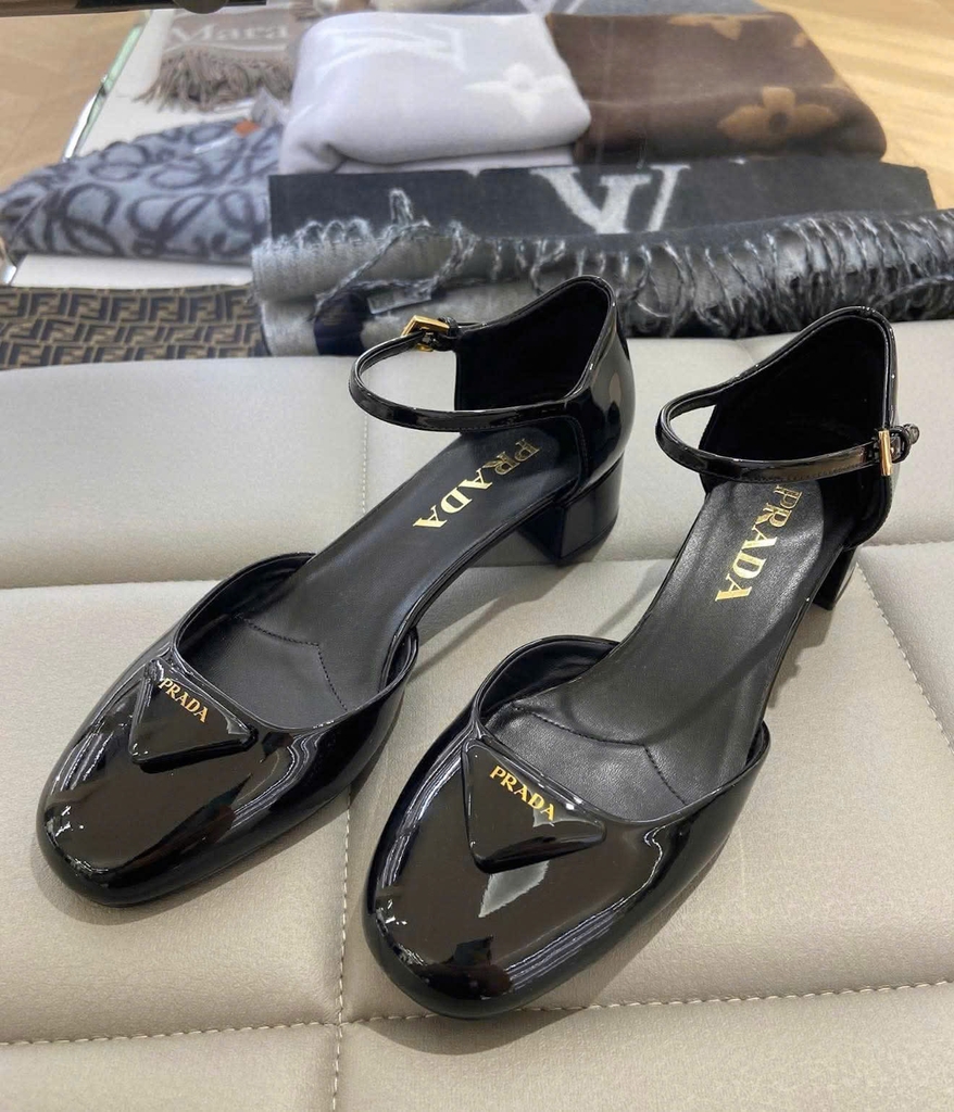 Giày Prada chất liệu da bóng (patent leather) cao cấp, bề mặt sáng gương sang trọng. Thiết kế mũi vuông hiện đại, gót vuông thấp dễ đi, quai ngang cổ chân giúp ôm chân và tạo cảm giác chắc chắn. Điểm nhấn logo PRADA kim loại tinh tế ở mũi giày, phù hợp đi làm, dạo phố hay dự tiệc nhẹ.