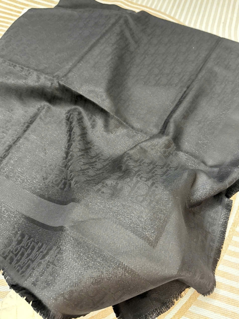 Khăn Dior màu đen trơn tinh tế, hoạ tiết dệt chìm sang trọng, chất vải mềm mịn – nhẹ – thoáng, quàng không bí và lên form cực đẹp. Phù hợp diện đi làm, đi chơi, phối được nhiều outfit từ basic đến sang trọng.