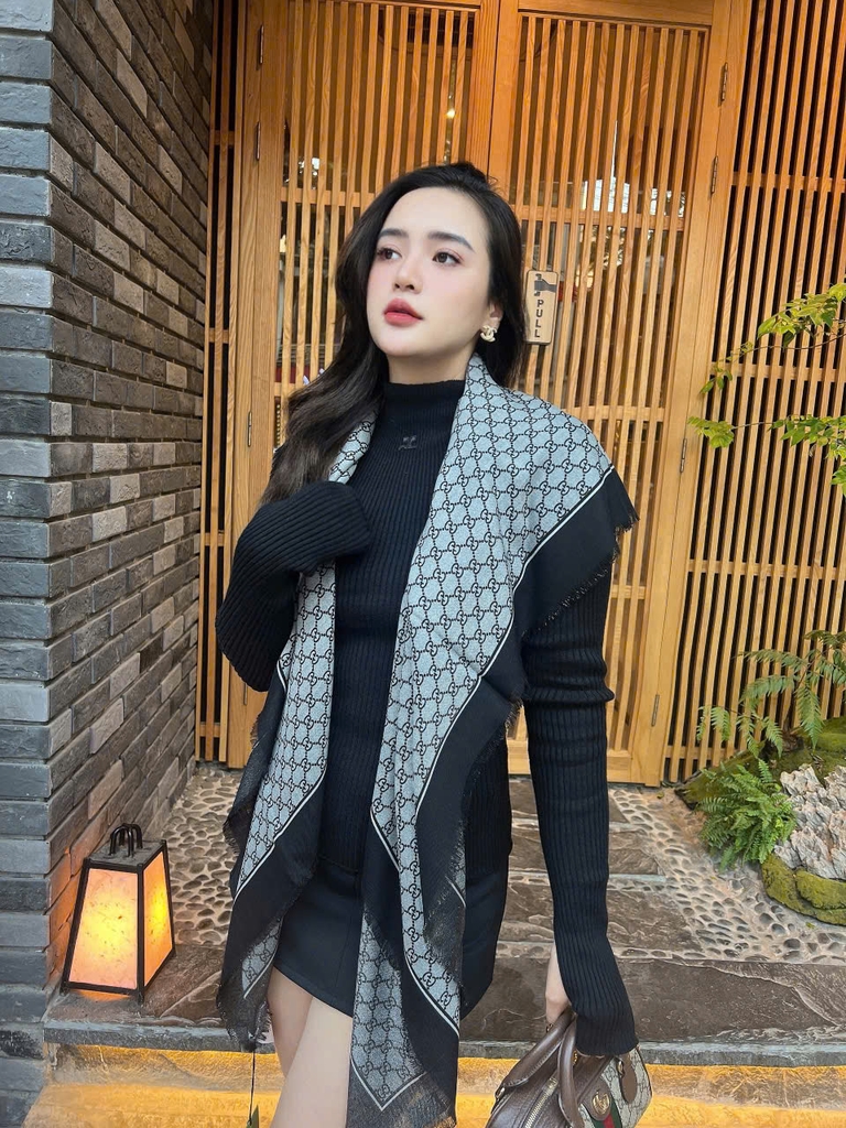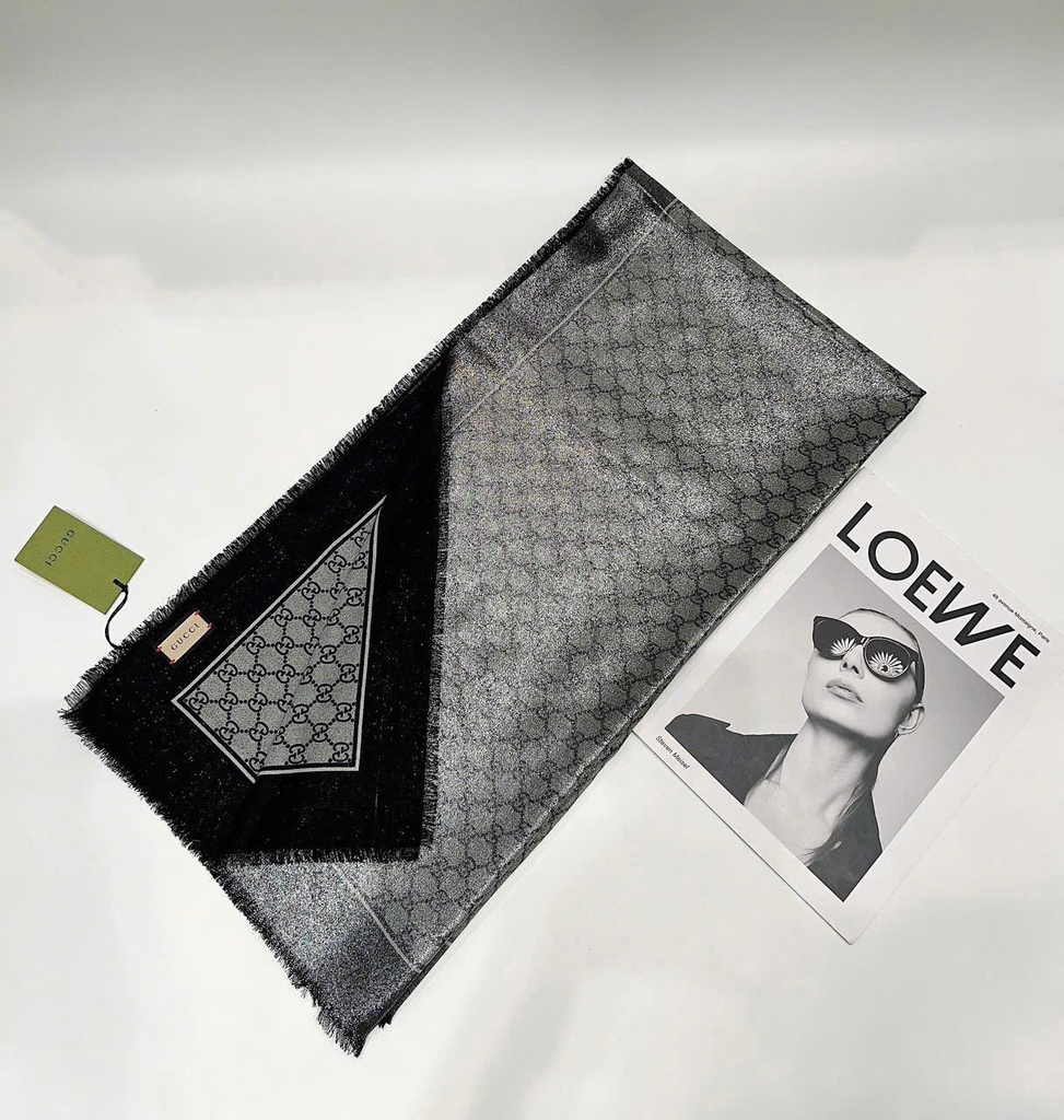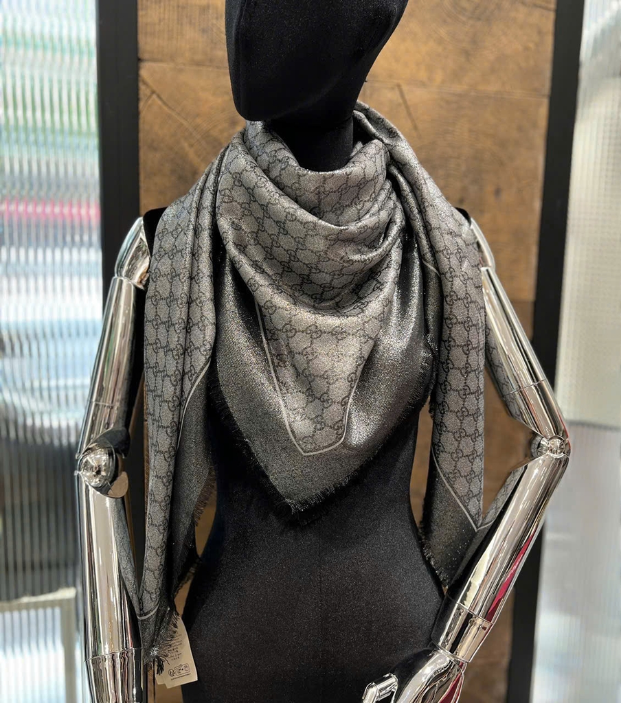 Chiếc khăn choàng Gucci biểu tượng với họa tiết GG monogram đặc trưng, tông Đen bạc trung tính sang trọng – dễ dàng mix cùng mọi phong cách, từ công sở thanh lịch đến street style cá tính.