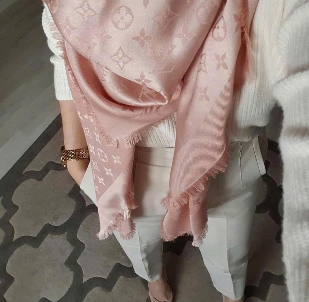 Màu hồng pastel dịu ngọt, họa tiết Monogram LV dệt nổi tinh xảo, dễ phối đồ – vừa quàng cổ, choàng vai hay làm phụ kiện túi đều nổi bật.