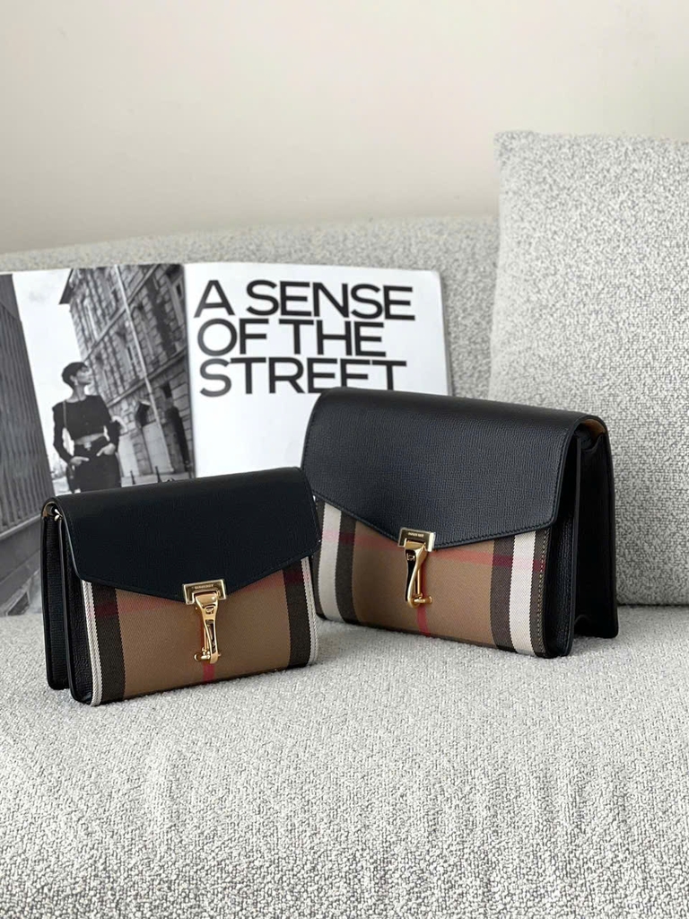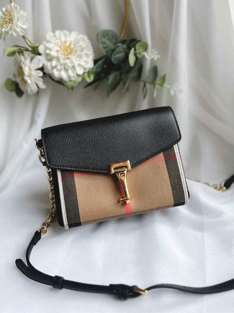 Thiết kế túi đeo chéo phối da đen và họa tiết Vintage Check đặc trưng của Burberry. Điểm nhấn khóa kim loại sang xịn cùng dây xích tinh tế, giúp tổng thể vừa nữ tính vừa đẳng cấp. Form gọn gàng, tiện mang theo khi đi tiệc, đi chơi hoặc hẹn hò.