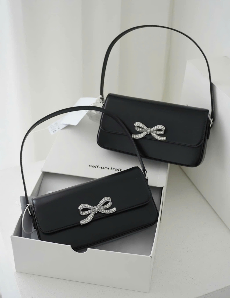 Chiếc túi mini đến từ thương hiệu Self-Portrait mang thiết kế sang trọng với điểm nhấn là nơ đính đá pha lê lấp lánh ở mặt trước, tạo nên vẻ nữ tính và tinh tế. Form túi cứng cáp, nhỏ gọn nhưng đủ sức chứa các vật dụng cần thiết như điện thoại, ví nhỏ, son môi... Phù hợp cho cả đi làm, đi tiệc hoặc dạo phố.