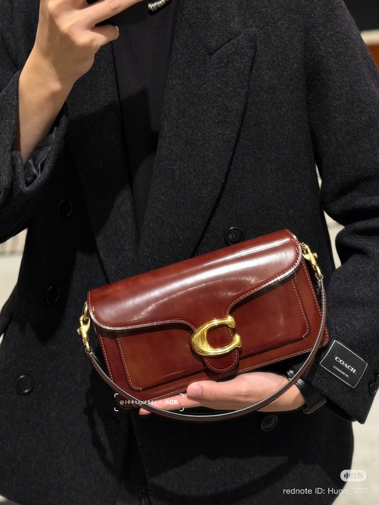 Túi Coach Tabby thiết kế dáng shoulder thanh lịch, gam nâu da bò ánh rượu cực kỳ sang và dễ phối đồ. Chất liệu da trơn cao cấp bề mặt bóng nhẹ, càng dùng càng đẹp. Điểm nhấn khóa chữ C kim loại mạ vàng biểu tượng Coach, đường may sắc nét, form túi gọn gàng nhưng vẫn đựng đủ vật dụng cần thiết. Có thể đeo vai hoặc đeo chéo linh hoạt – phù hợp đi làm, dạo phố hay sự kiện.