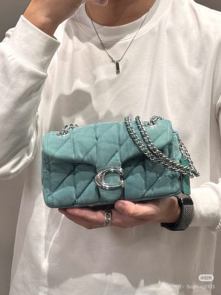 Túi Coach Tabby chần bông dáng nhỏ xinh, chất liệu vải canvas denim phối da cao cấp, form đứng đẹp. Gam xanh pastel trẻ trung, khóa C kim loại ánh bạc sang trọng, dây đeo xích phối da có thể đeo vai hoặc đeo chéo linh hoạt – cực kỳ tôn outfit.