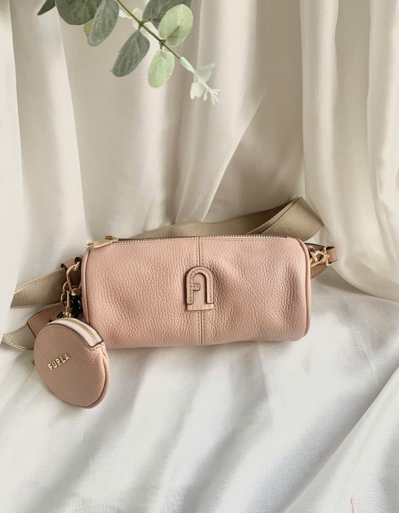 Túi xách Furla thiết kế dáng trụ nhỏ gọn, chất liệu da vân cao cấp mềm mại và bền đẹp. Gam màu hồng nổi bật giúp tổng thể thêm trẻ trung, nữ tính và cực kỳ thu hút. Túi đi kèm dây đeo bản to chắc chắn cùng ví tròn nhỏ xinh tiện đựng tai nghe, chìa khóa hoặc tiền lẻ. Kích thước gọn gàng nhưng vẫn đủ không gian để điện thoại, son, ví và các vật dụng cá nhân cần thiết.