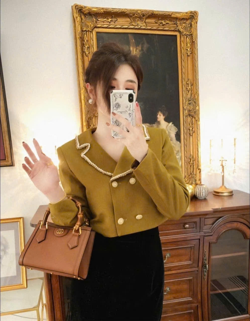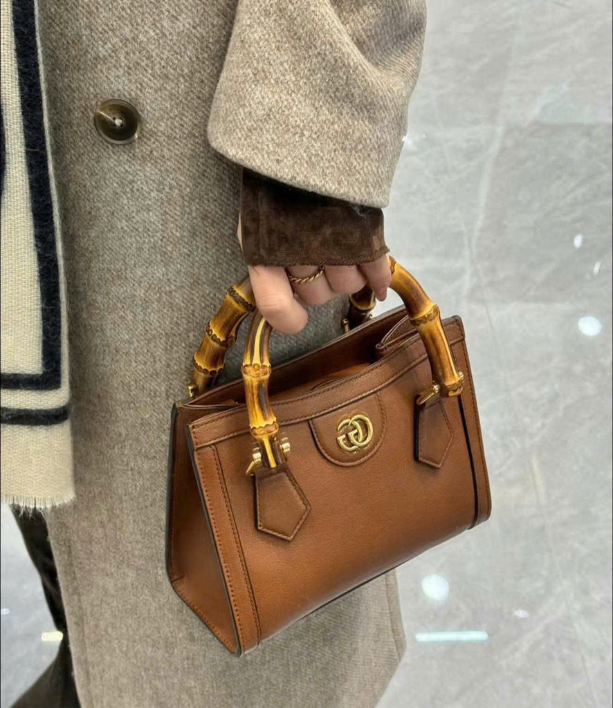 Chiếc túi xách dáng hộp sang trọng, chất liệu da thật mềm mịn, lên form chuẩn. Điểm nhấn nổi bật là quai xách dạng gỗ/bamboo cứng cáp, tạo cảm giác thanh lịch và khác biệt. Thiết kế khóa kim loại màu vàng nổi bật mặt trước, vừa chắc chắn vừa tăng tính thẩm mỹ. Form nhỏ gọn nhưng đủ sức chứa điện thoại, ví, son và các vật dụng cần thiết khi ra ngoài.