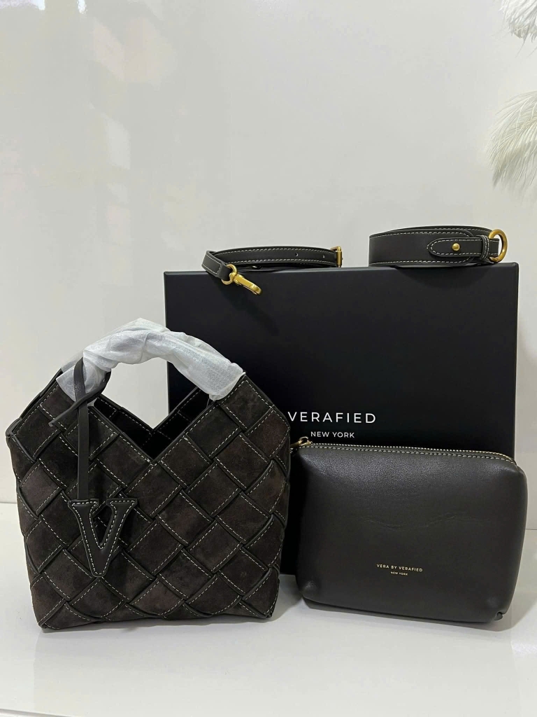Form túi đứng dáng, tay cầm chắc chắn, logo chữ V nổi bật – mang đậm dấu ấn đặc trưng của nhà Verified.