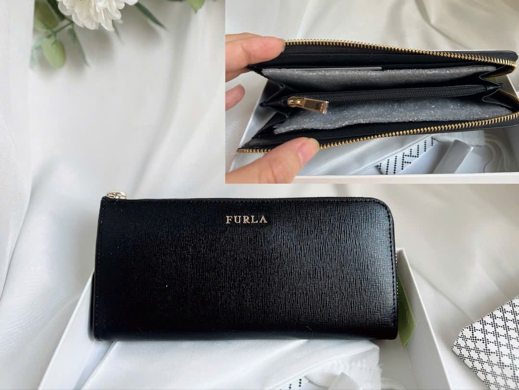 Ví Furla dáng dài cổ điển, gam màu đen sang trọng dễ phối. Chất liệu da vân cao cấp, mềm mại nhưng bền đẹp. Thiết kế khóa kéo chắc chắn, bên trong nhiều ngăn tiện lợi đựng tiền mặt, thẻ và giấy tờ. Logo Furla mạ kim loại tinh tế tạo điểm nhấn sang trọng.