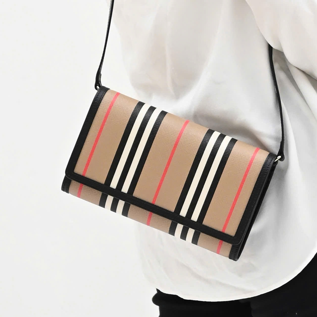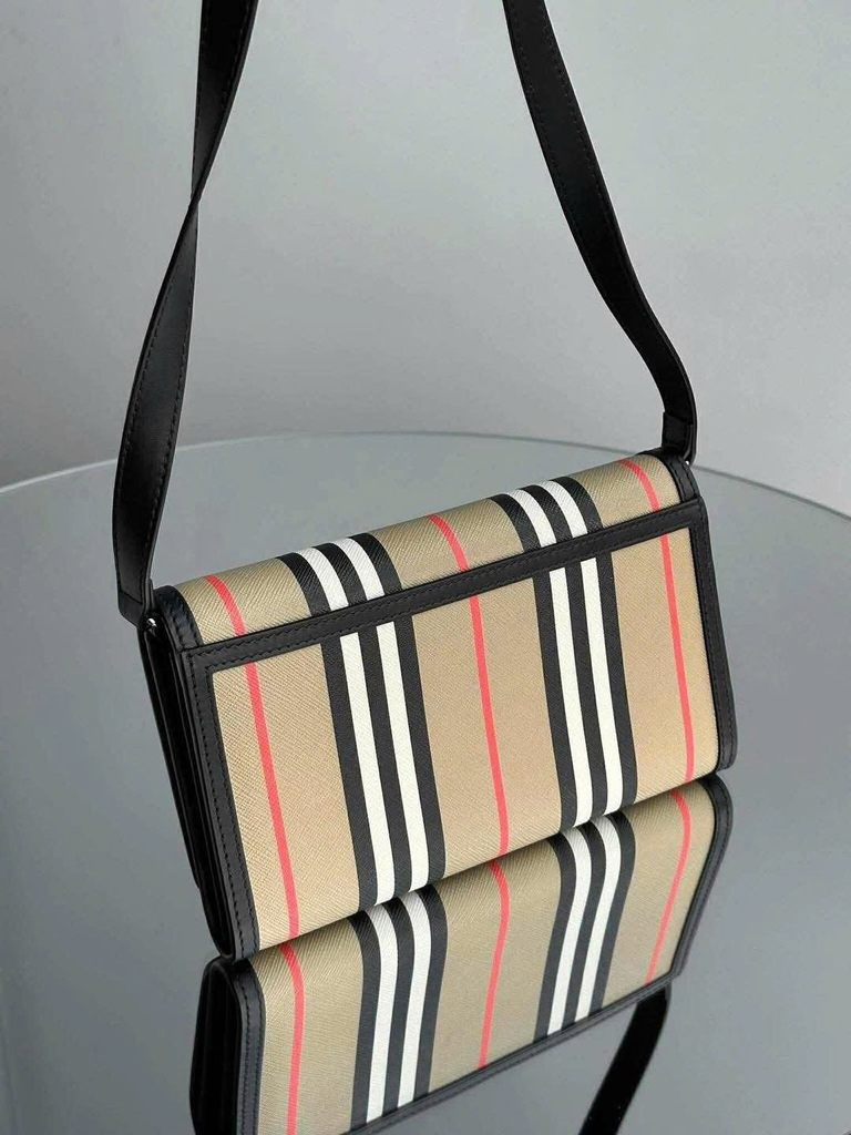 - Họa tiết sọc đặc trưng của Burberry nổi bật với tông màu beige, đen, trắng và đỏ tạo điểm nhấn sang trọng.